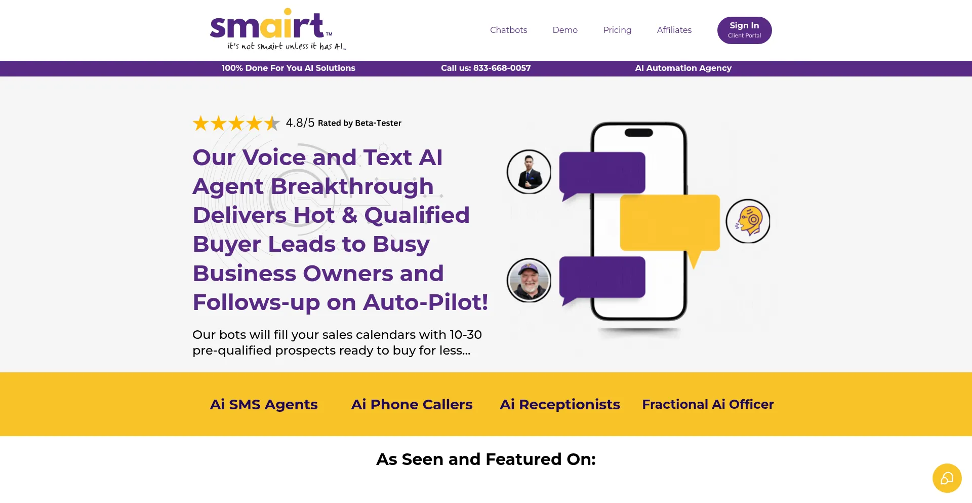 Say goodbye to weak conversions. Smairt.AI offers powerful AI Phone or SMS Agents to follow up with leads faster which boost sales using conversational AI. Powerful AI automatio...