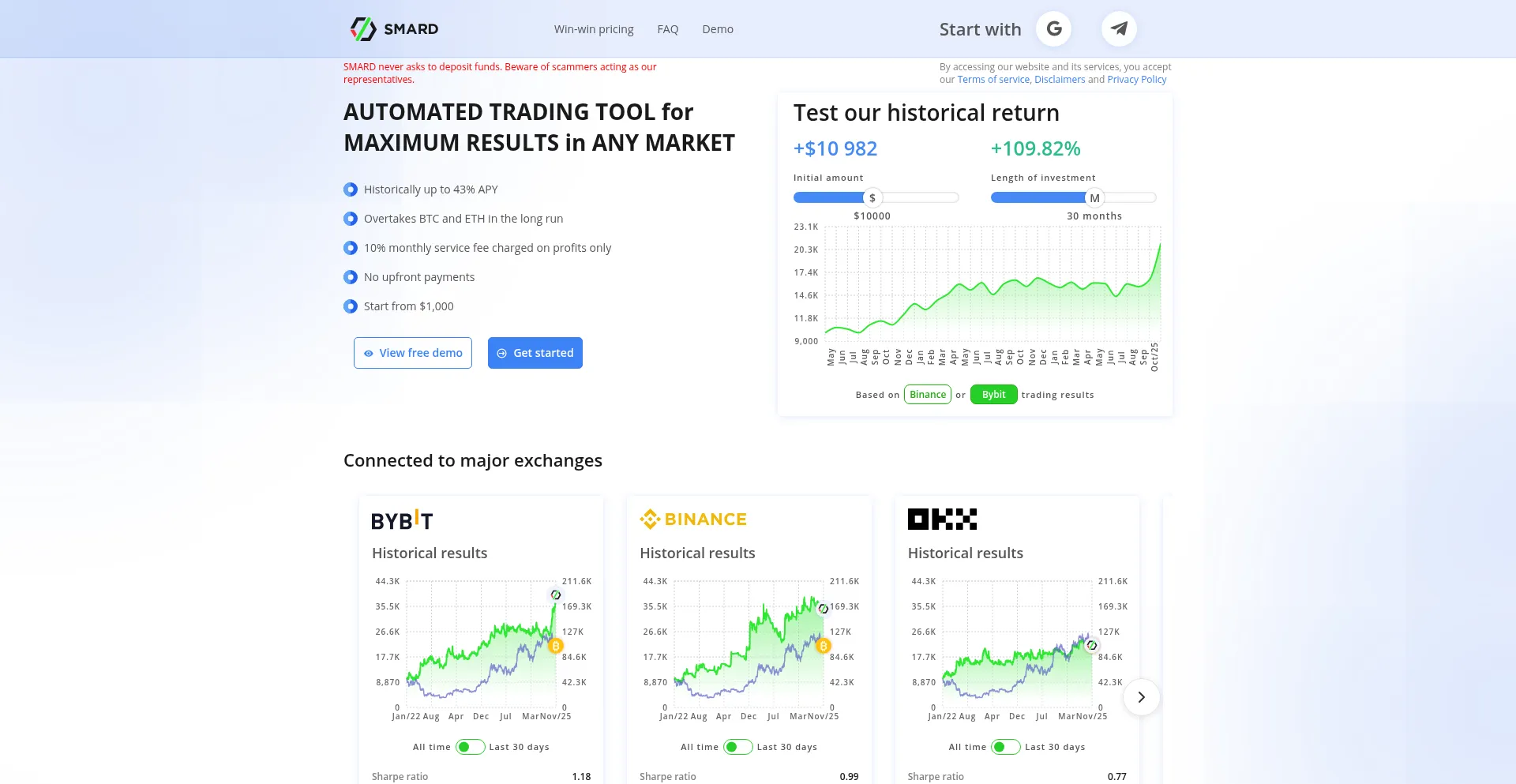 Powerful platform for automated crypto trading ⚡No upfront payments ✔ Up to 5% average monthly return ✔ Overtakes BTC and ETH in the long run ✔ 10% monthly service fee c...