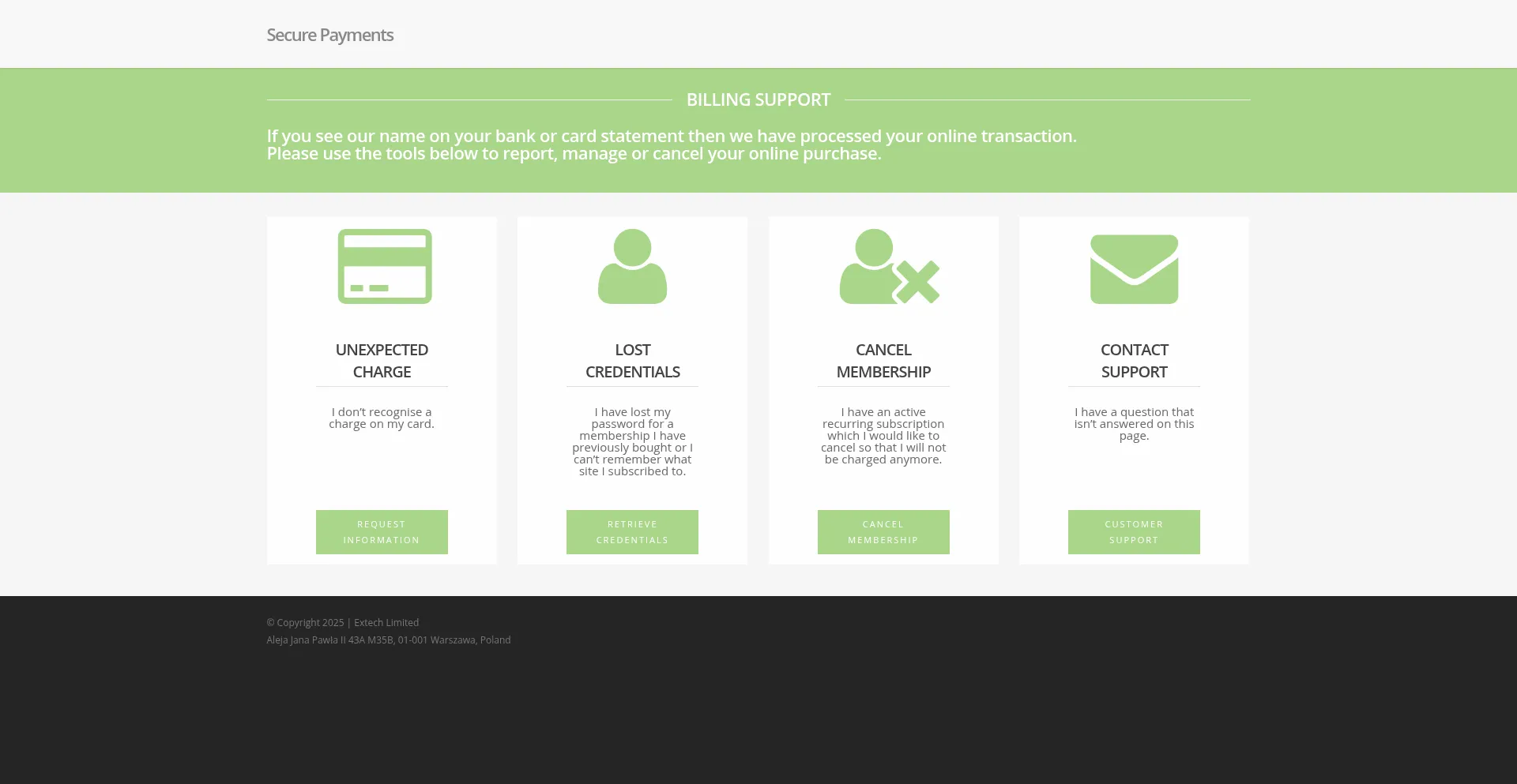 The website contains dedicated sections addressing payment disputes, subscription management, chargeback procedures, refund policies, and other financial transaction concerns, indicating established billing operations.