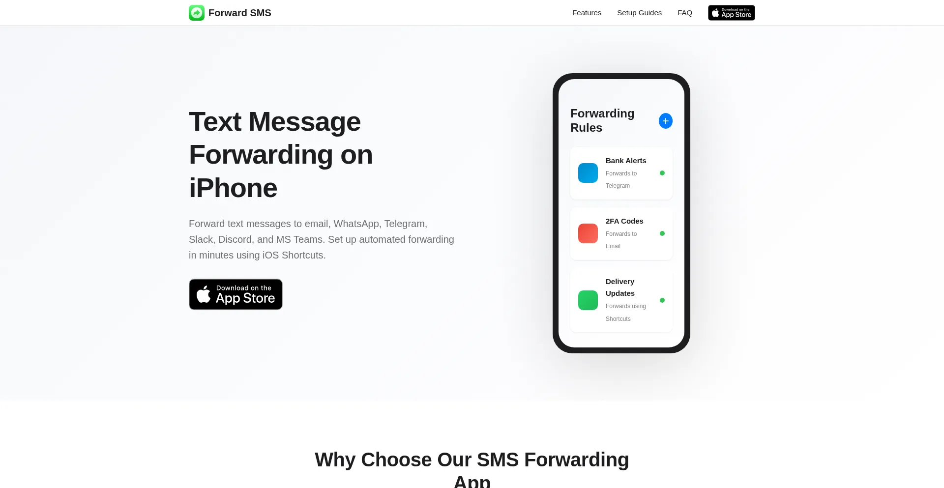 Learn how to forward text messages on iPhone to email, WhatsApp, Telegram, Slack, Discord, and MS Teams. Simple setup with iOS Shortcuts. Privacy-first forwarding app.