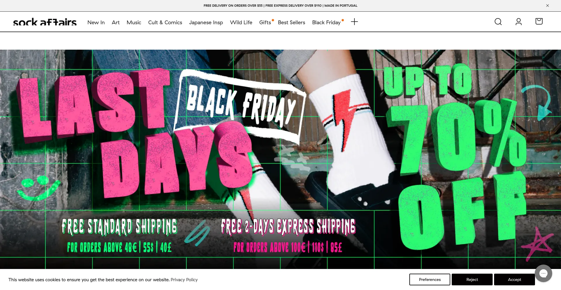 Our analyzer determines that website sockaffairs.com is using Shopify CMS. Shopify is a popular e-commerce platform, powering around 4.4% of websites globally.