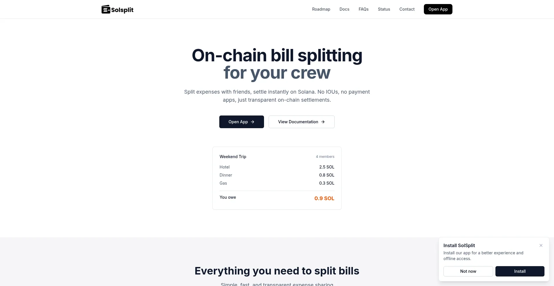Split expenses with friends and settle instantly on Solana. No IOUs, just transparent on-chain settlements. Free, fast, and secure expense tracking.