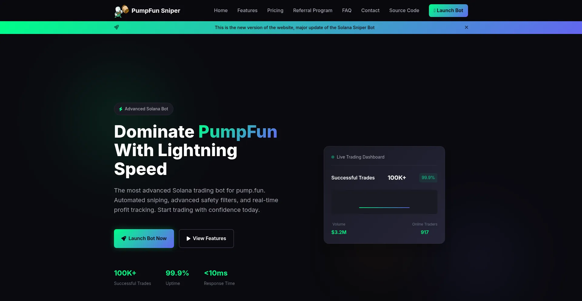 The most advanced Solana trading bot for pump.fun. Automated sniping, advanced filters, and real-time profit tracking.