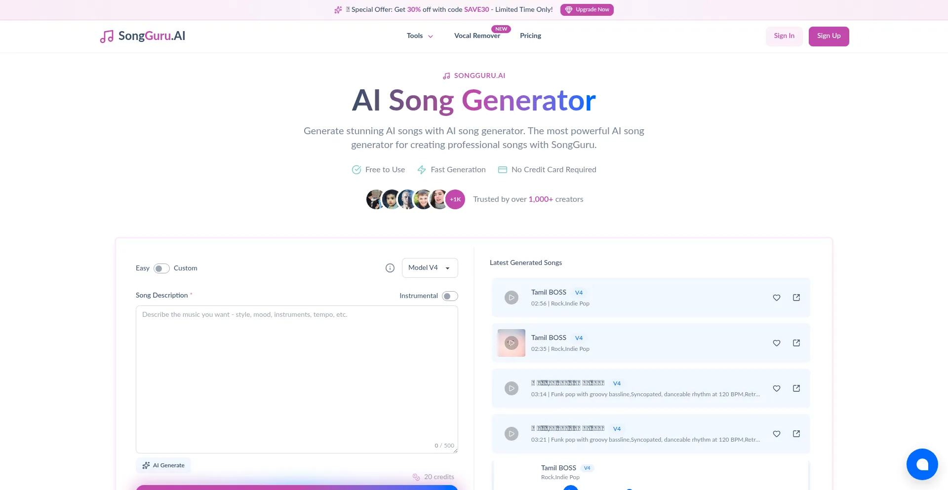 Generate custom songs with AI song generator by SongGuru.AI. Create music from lyrics or prompts with advanced AI models.