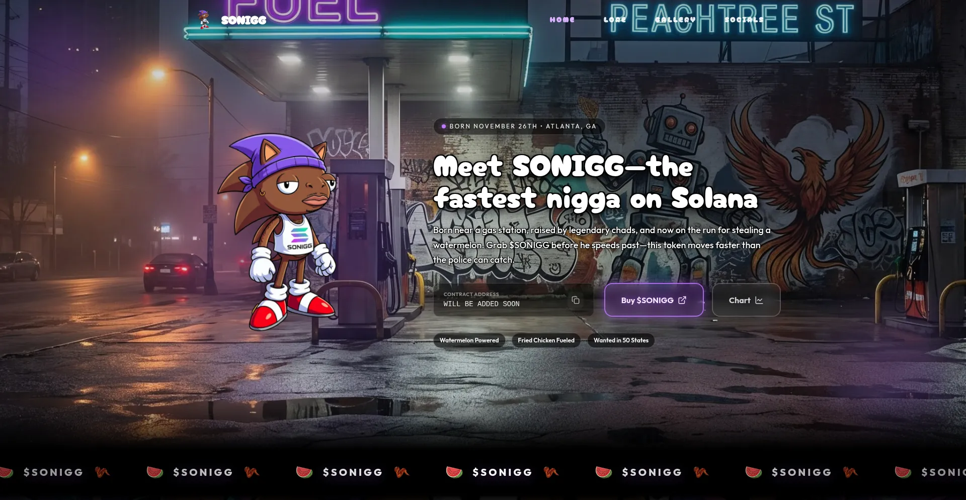 Meet SONIGG—the fastest nigga on Solana. Born near a gas station in Atlanta, raised by legendary chads, now on the run for stealing a watermelon. $SONIGG