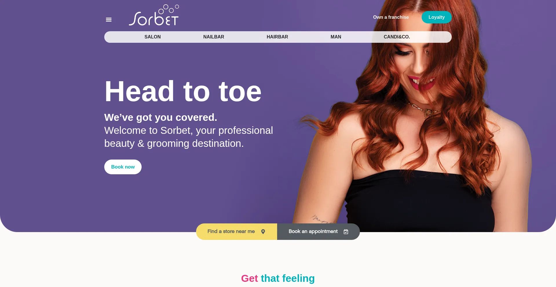 Head to toe We’ve got you covered. Welcome to Sorbet, your professional beauty & grooming destination. Book now Find a store near me Book an appointment Find a store near me B...