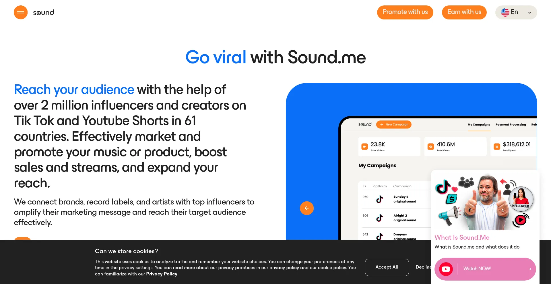 Elevate your music career with Sound.me! Access a global network of over 2 million creators on TikTok and YouTube Shorts to drive engagement!