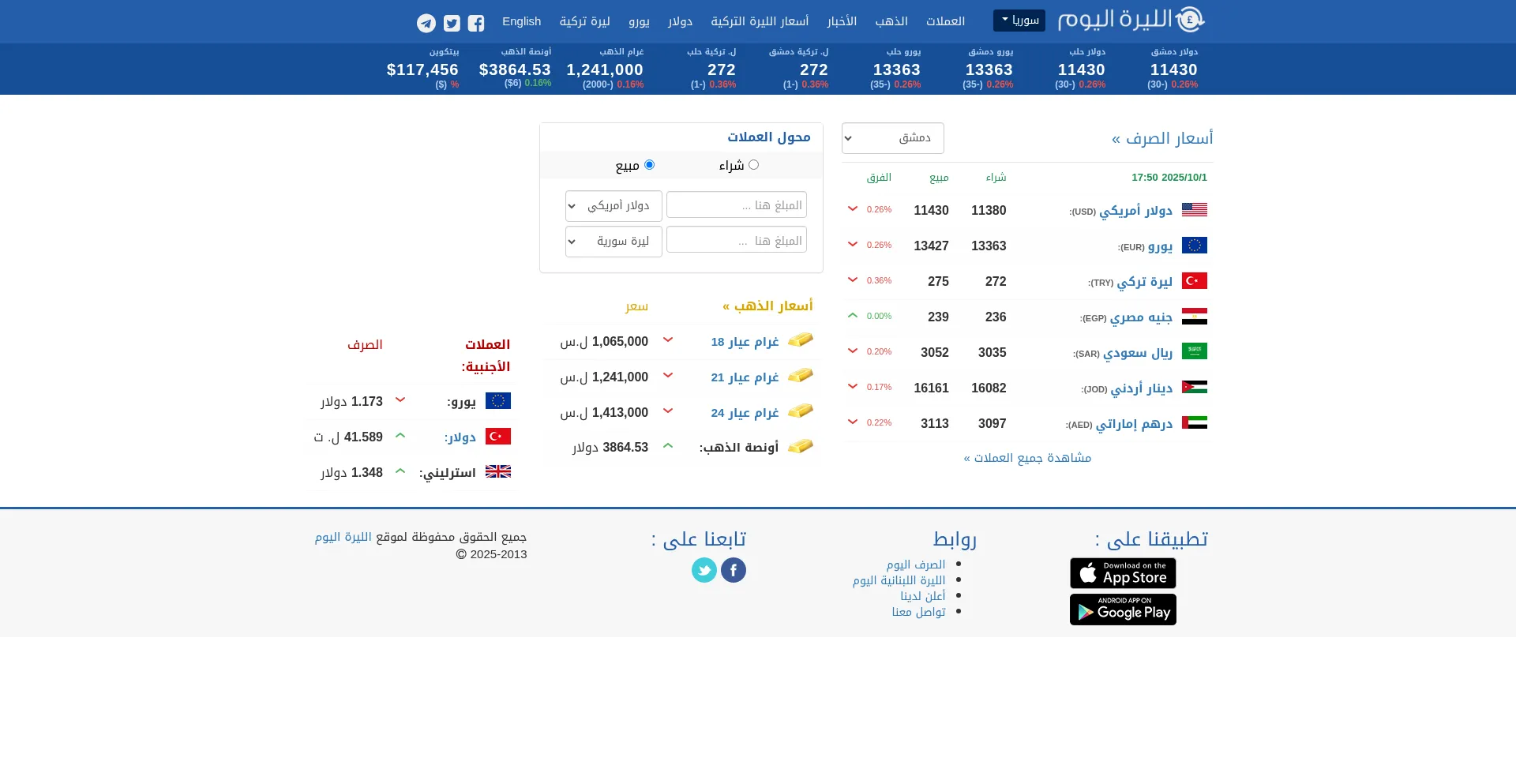 موقع الليرة اليوم لأسعار العملات والذهب مقابل الليرة السورية مع حاسبة من وإلى الليرة السورية