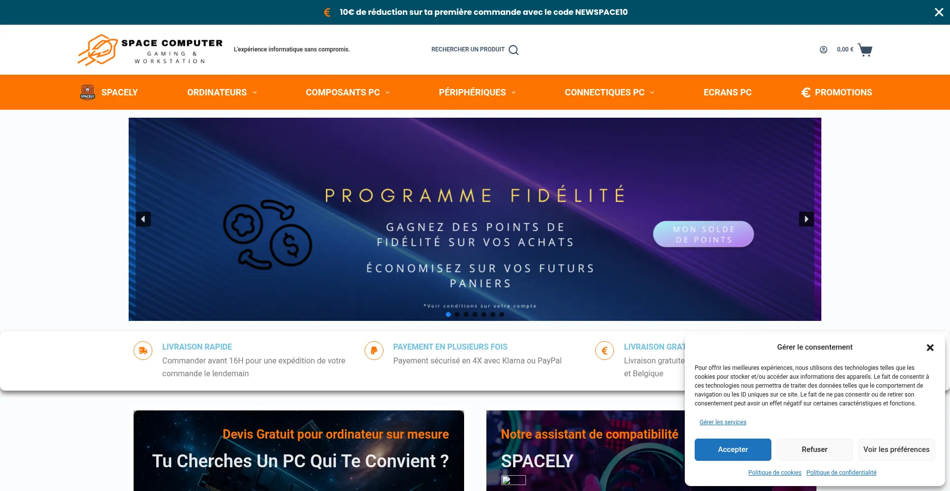 Analysis indicates that spacecomputer.fr operates as an e-commerce platform facilitating online transactions for goods or services. The website implements shopping cart functionality, payment processing systems, and product catalog features typical of commercial retail operations.