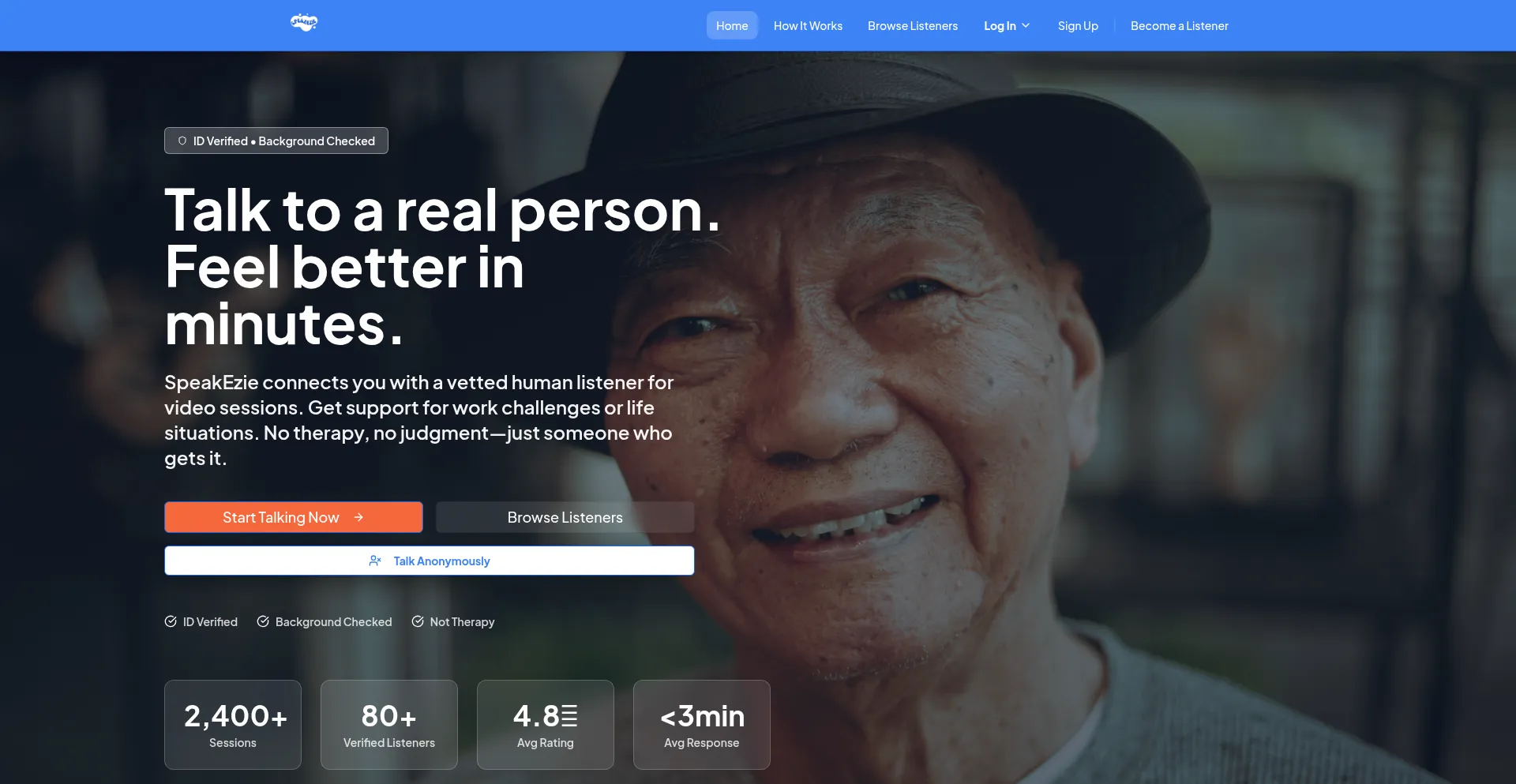 Connect with verified listeners for video sessions in minutes. Get professional guidance for work challenges or personal support for life situations. ID verified, background che...