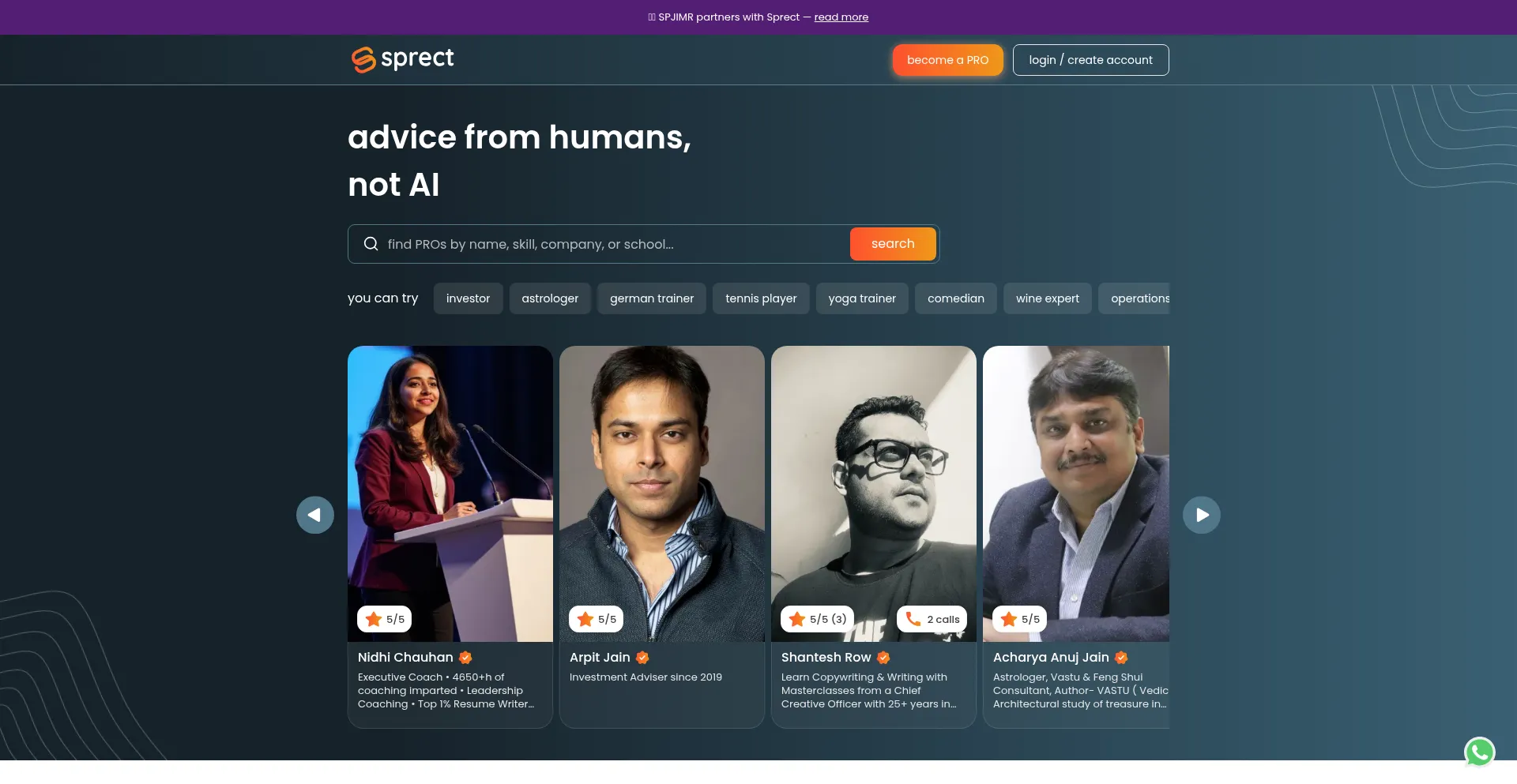 Sprect helps you level up. Get inspiration or personalised advice from knowledgeable people all over the world. Consult online - quickly and directly.