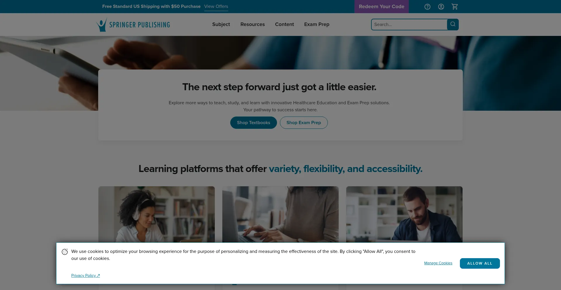 The website implements cookie consent mechanisms in compliance with privacy regulations such as GDPR or CCPA. This demonstrates that springerpub.com adheres to data protection standards and provides users with control over personal data collection practices.