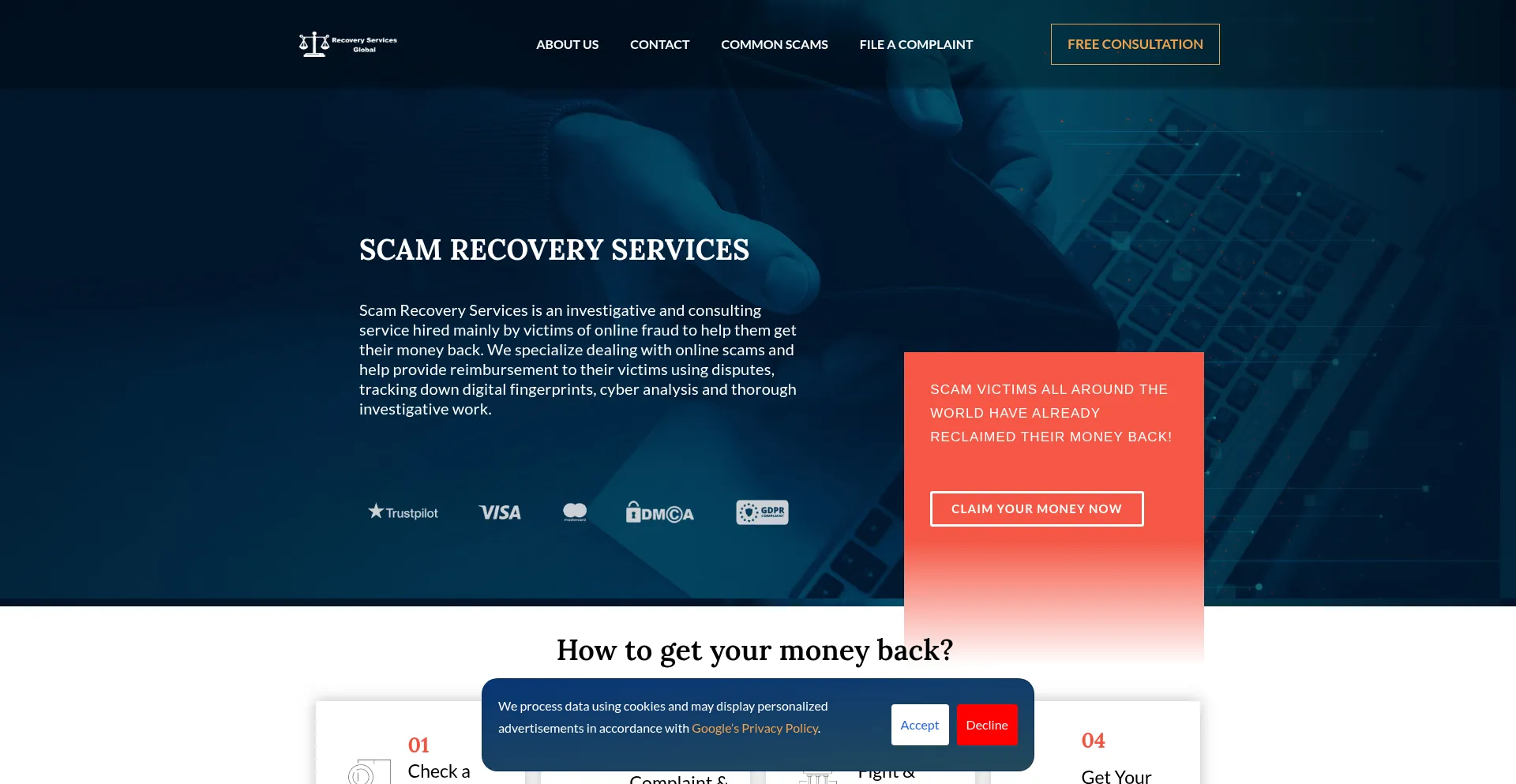The website srvclwglbl.online advertises fund recovery services for lost or stolen assets. While some operate on contingency fee structures, others may require upfront payments, which can indicate fraudulent operations. Verify credentials and regulatory compliance before engaging such services.