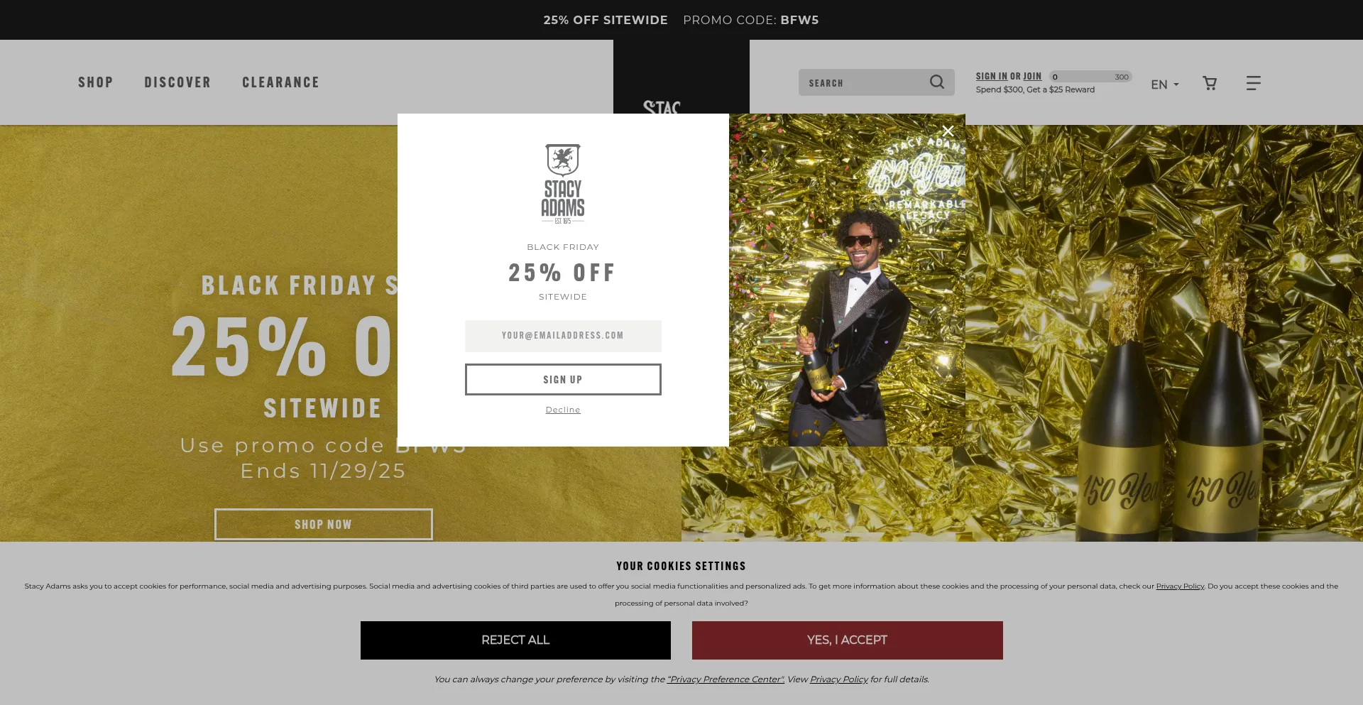Analysis indicates that stacyadams.ca operates as an e-commerce platform facilitating online transactions for goods or services. The website implements shopping cart functionality, payment processing systems, and product catalog features typical of commercial retail operations.