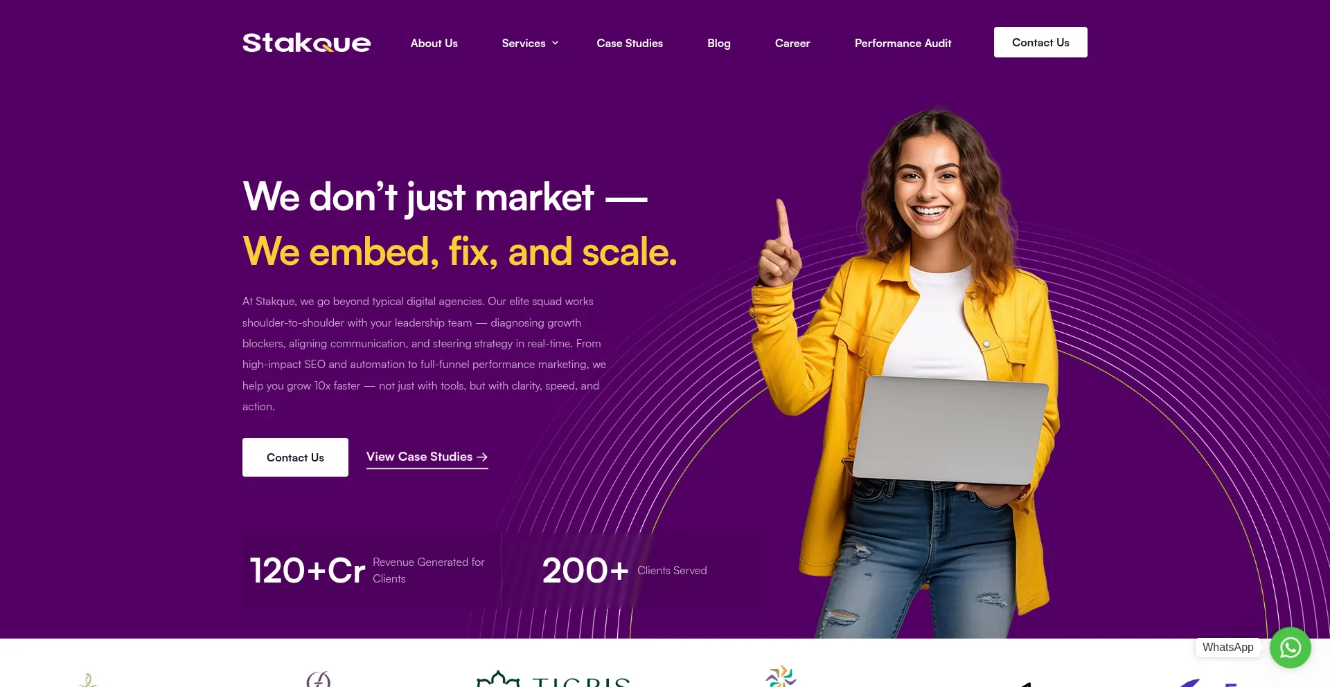 At Stakque, we go beyond typical digital agencies. Our elite squad works shoulder-to-shoulder with your leadership team — diagnosing growth blockers, aligning