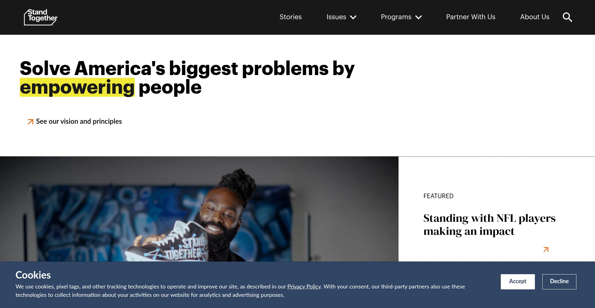 The website implements cookie consent mechanisms in compliance with privacy regulations such as GDPR or CCPA. This demonstrates that standtogether.org adheres to data protection standards and provides users with control over personal data collection practices.