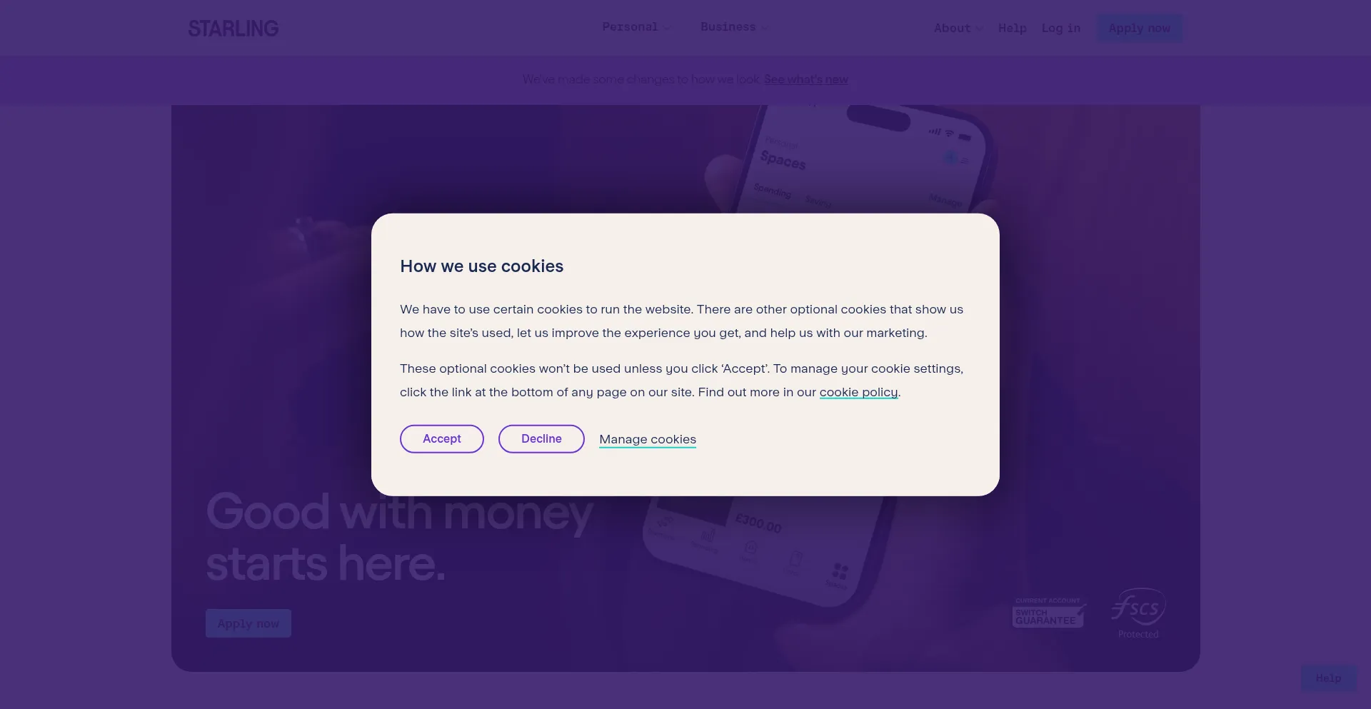 The website implements cookie consent mechanisms in compliance with privacy regulations such as GDPR or CCPA. This demonstrates that starlingbank.com adheres to data protection standards and provides users with control over personal data collection practices.