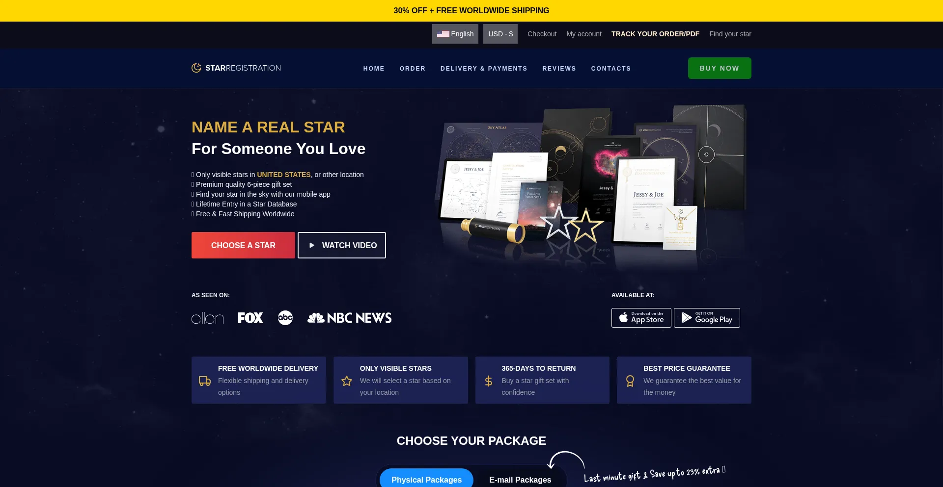 Buy a star and receive a gift package that includes star certificate, star map and official registration in the celestial database.