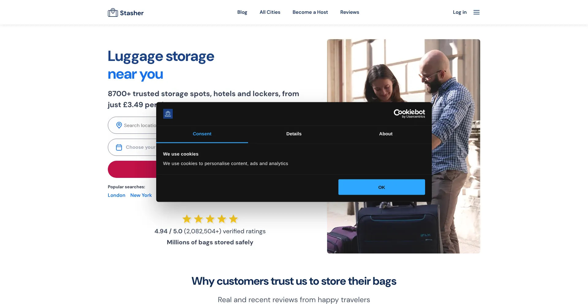 The website implements cookie consent mechanisms in compliance with privacy regulations such as GDPR or CCPA. This demonstrates that stasher.com adheres to data protection standards and provides users with control over personal data collection practices.