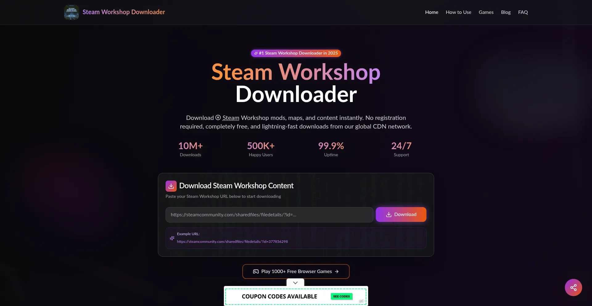 Download Steam Workshop mods, maps & content instantly. No login required. Free, fast & safe downloader for CS2, GMod, Cities Skylines & 5000+ games.