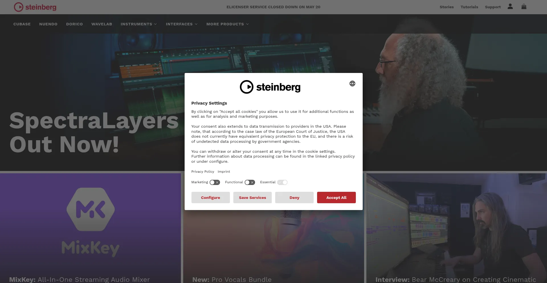 The website implements cookie consent mechanisms in compliance with privacy regulations such as GDPR or CCPA. This demonstrates that steinberg.net adheres to data protection standards and provides users with control over personal data collection practices.