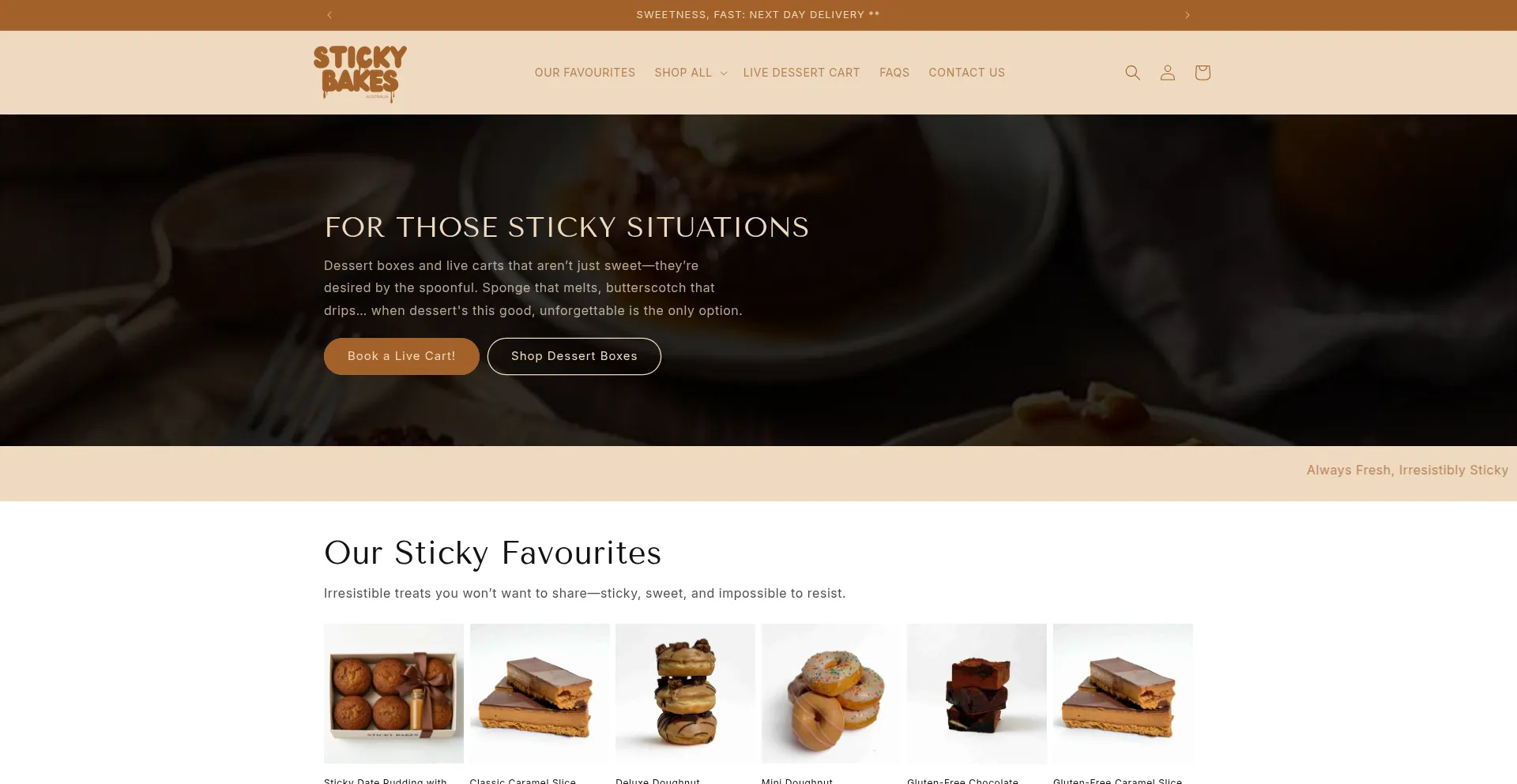 Sticky Bakes Australia creates indulgent desserts in Sydney, including brownies, sticky date pudding with butterscotch sauce, caramel slices, and doughnuts. Local delivery acros...