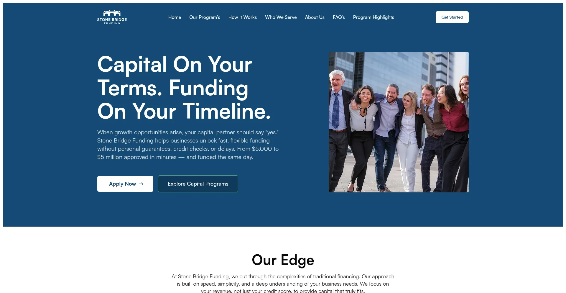 When growth opportunities arise, your capital partner should say "yes." Stone Bridge Funding helps businesses unlock fast, flexible funding without personal guarantees, credit c...