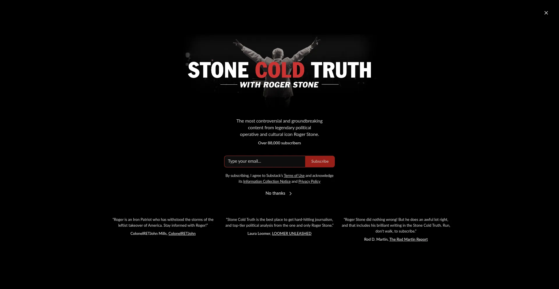 The most controversial and groundbreaking content from legendary political operative and cultural icon Roger Stone. Click to read Stone Cold Truth with Roger Stone, a Substack p...