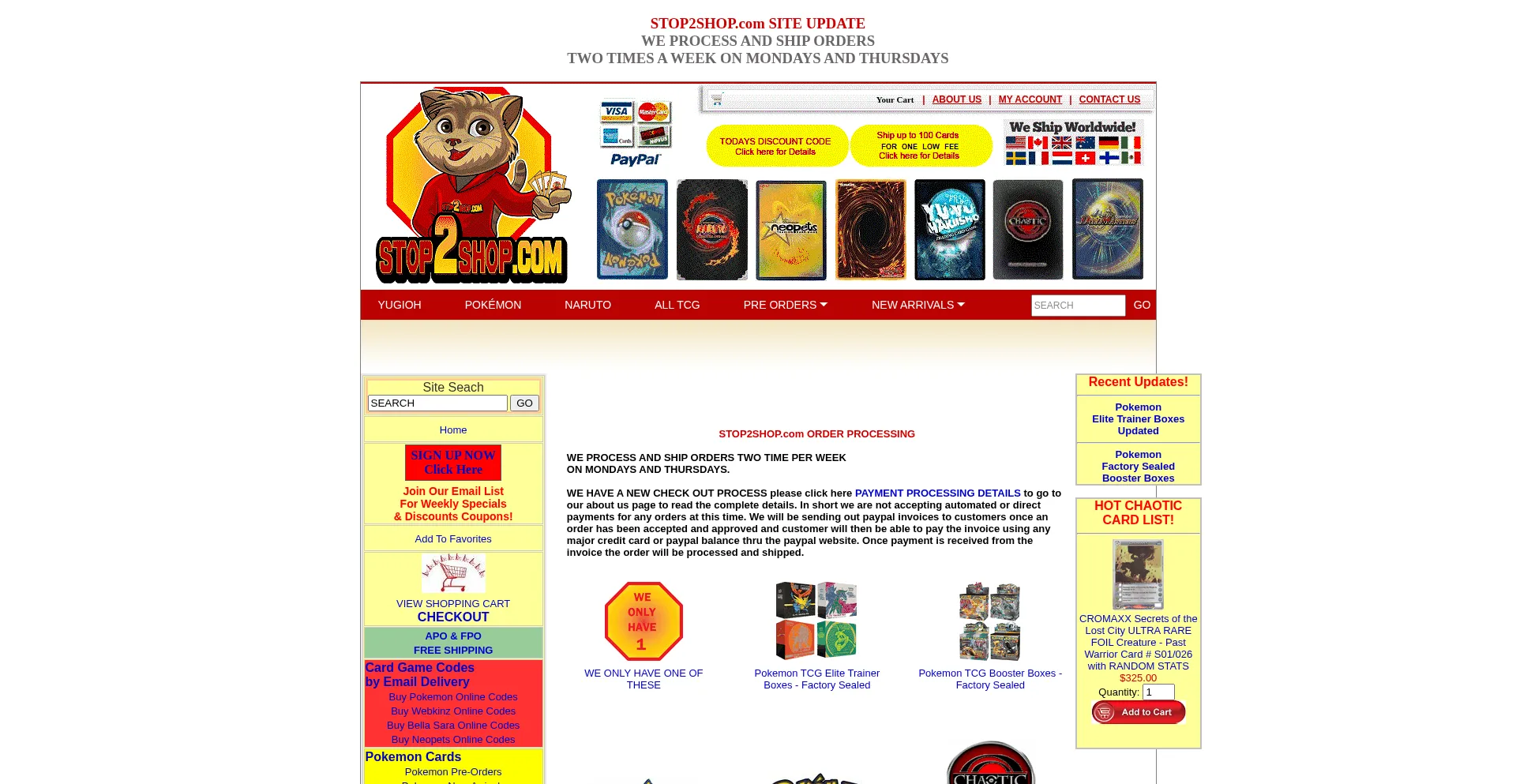 Stop2Shop.com Buy Cheap Pokemon Collector Tins and Online Code Cards Yugioh Yu-gi-oh God Card Naruto Cards Pokemon TCGO Neopets Yu-gioh Universe.com Yugi-oh Neopet Codes