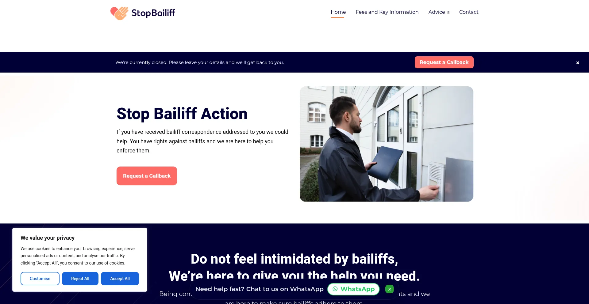 The website implements cookie consent mechanisms in compliance with privacy regulations such as GDPR or CCPA. This demonstrates that stopbailiff.co.uk adheres to data protection standards and provides users with control over personal data collection practices.