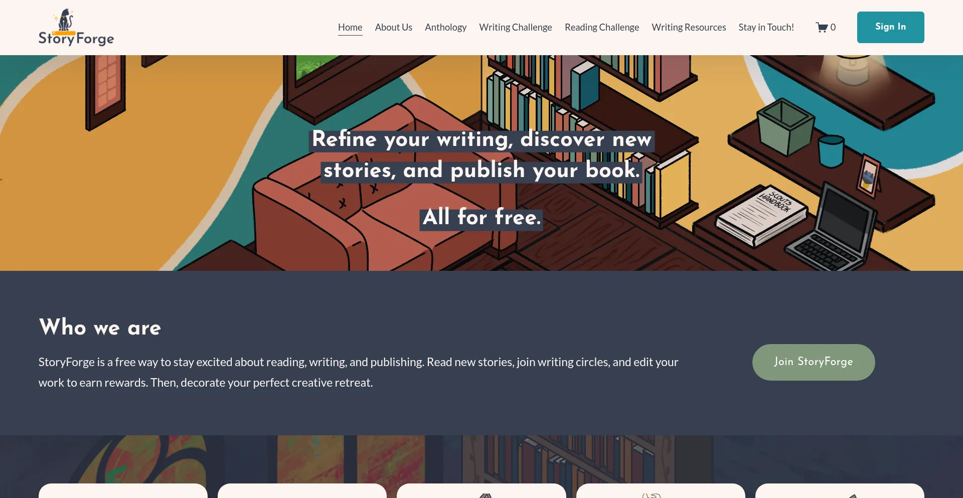 A story website where you can get reader feedback on your writing, build your own library, find your new favorite story, or publish a book - StoryForge