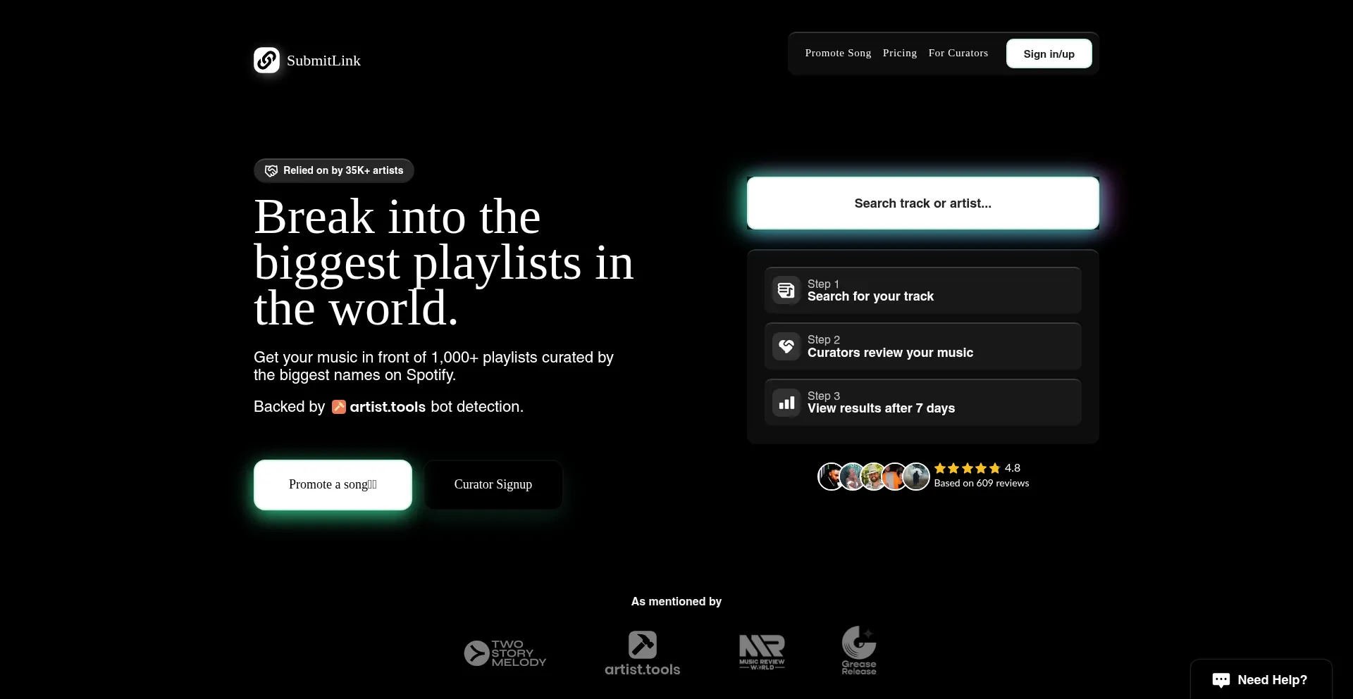 SubmitLink creates the link between artists looking to get their music heard, and playlist curators looking to hear new music. Submit to verified playlist curators at any budget!