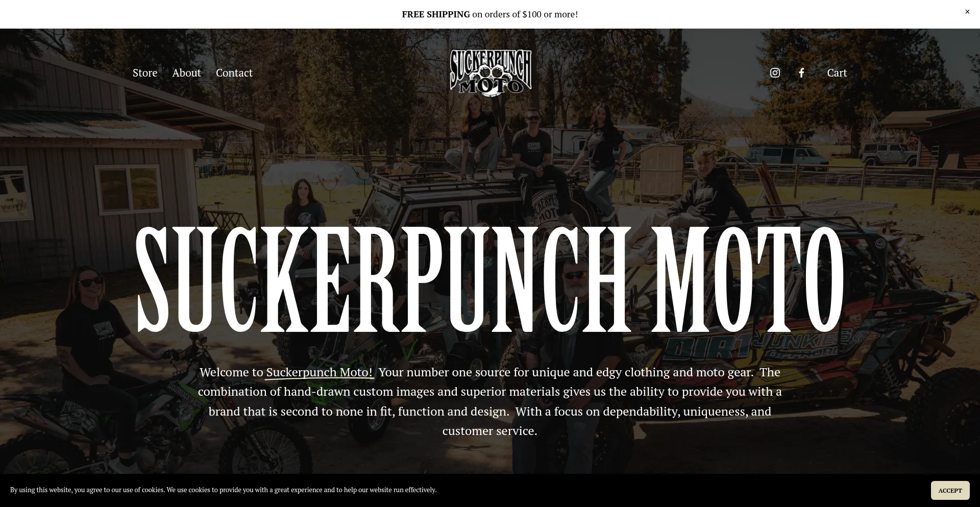 Analysis indicates that suckerpunchmoto.com operates as an e-commerce platform facilitating online transactions for goods or services. The website implements shopping cart functionality, payment processing systems, and product catalog features typical of commercial retail operations.
