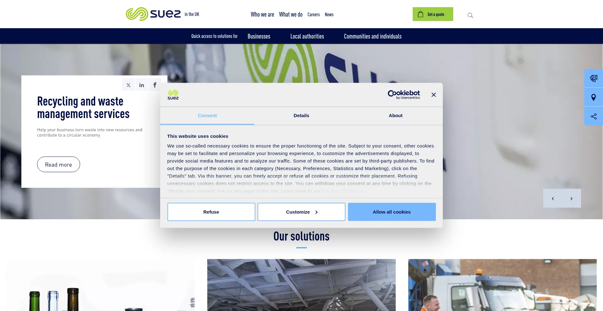 The website implements cookie consent mechanisms in compliance with privacy regulations such as GDPR or CCPA. This demonstrates that suez.co.uk adheres to data protection standards and provides users with control over personal data collection practices.
