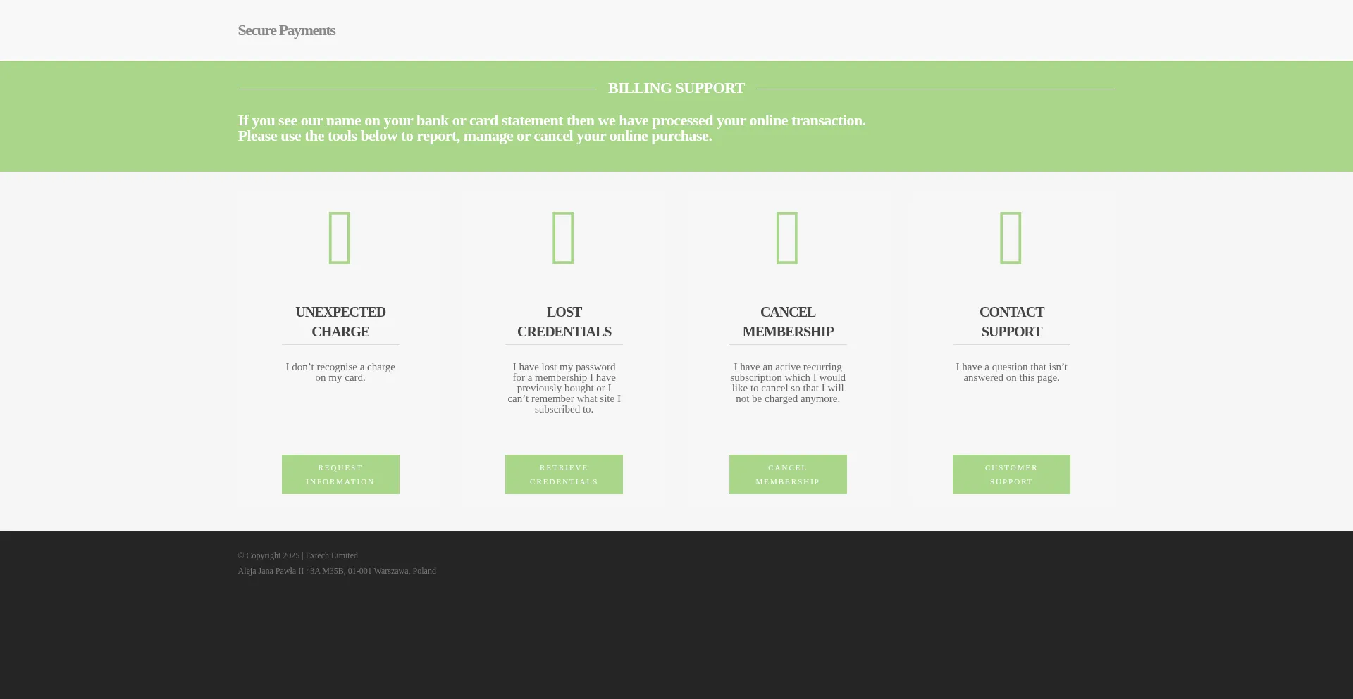 The website contains dedicated sections addressing payment disputes, subscription management, chargeback procedures, refund policies, and other financial transaction concerns, indicating established billing operations.