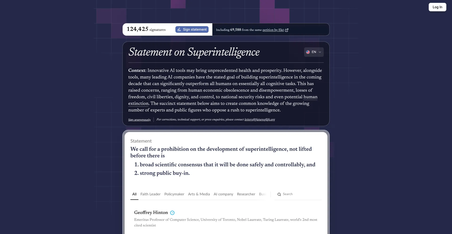 “We call for a prohibition on the development of superintelligence, not lifted before there is (1) broad scientific consensus that it will be done safely and contr...