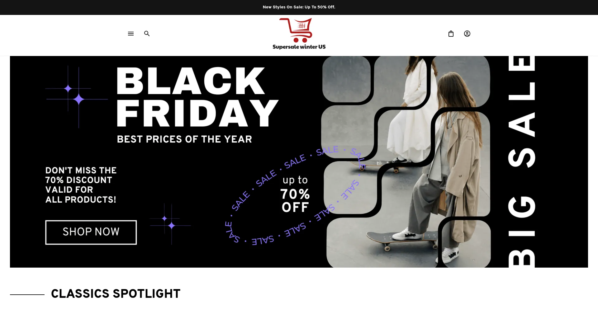 Analysis indicates that supersalewinterus.com operates as an e-commerce platform facilitating online transactions for goods or services. The website implements shopping cart functionality, payment processing systems, and product catalog features typical of commercial retail operations.