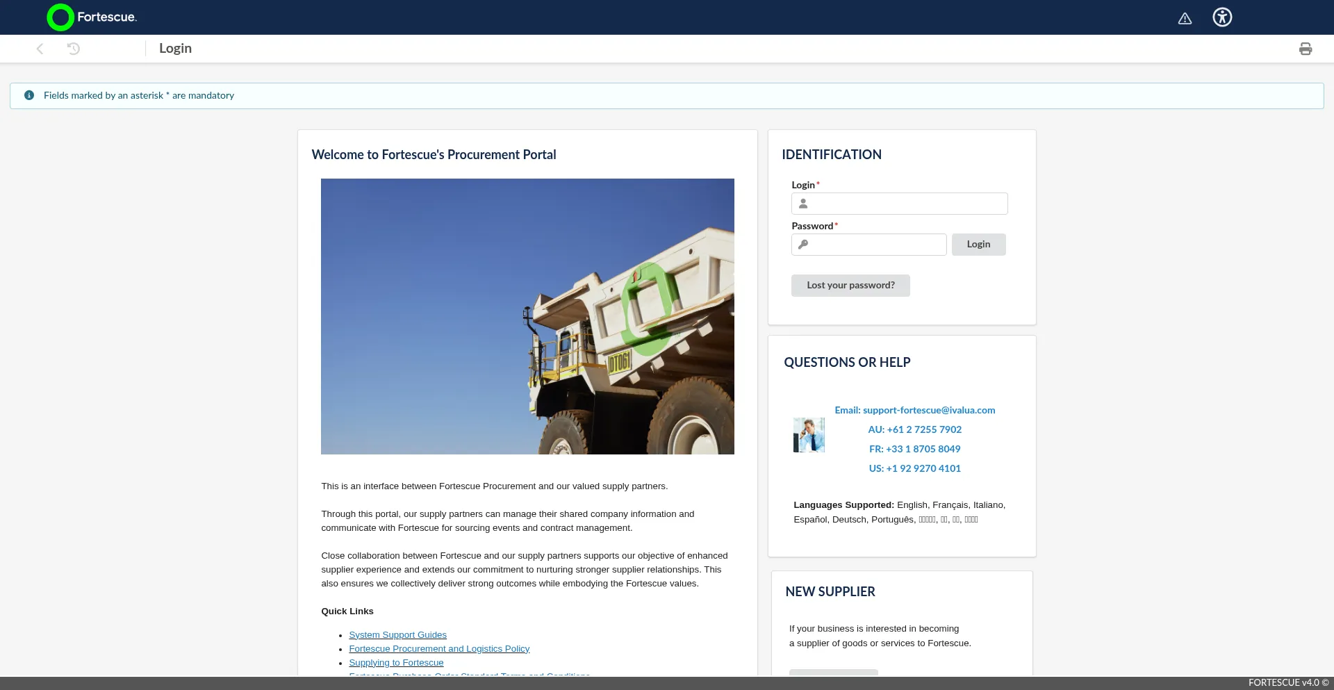 This is an interface between Fortescue Procurement and our valued supply partners.Through this portal, our supply partners can manage their shared company information and commun...
