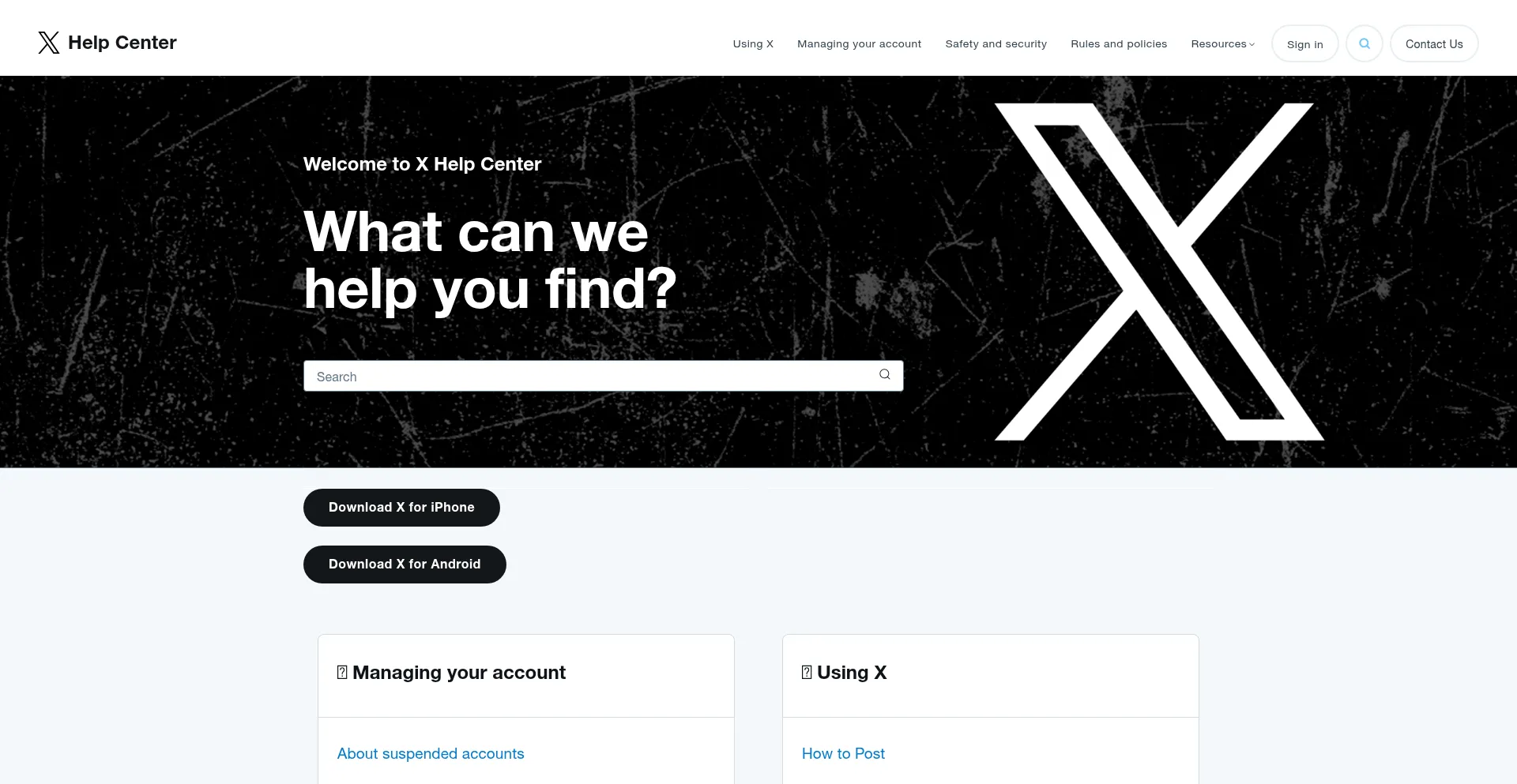 The support.x.com website offers a mobile application for Android devices, indicating expanded platform presence beyond web-based services.