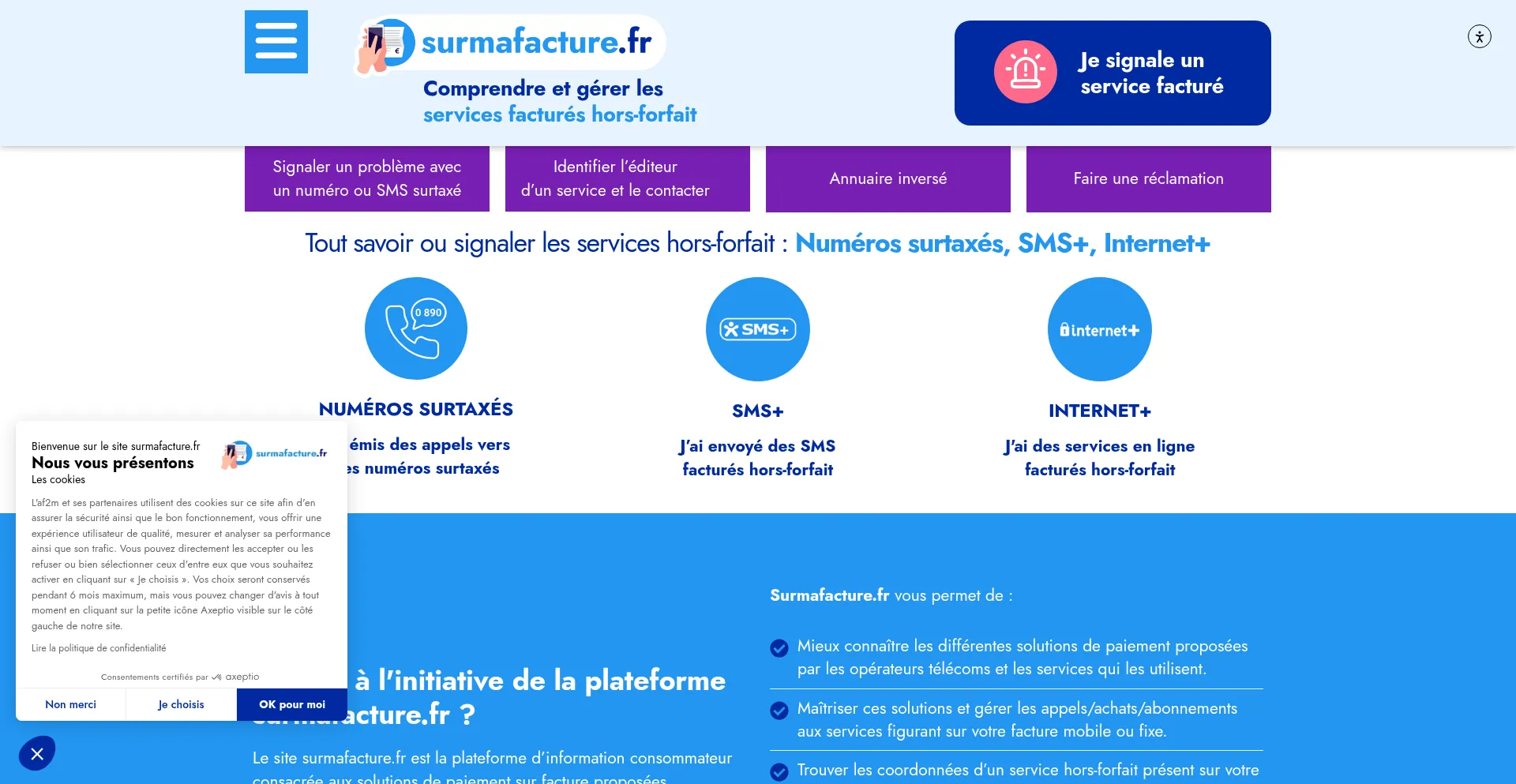 Le site surmafacture.fr propose un annuaire inversé permettant de retrouver et, si besoin signaler, un service facturé via un numéro surtaxé, SMS+ ou Internet+