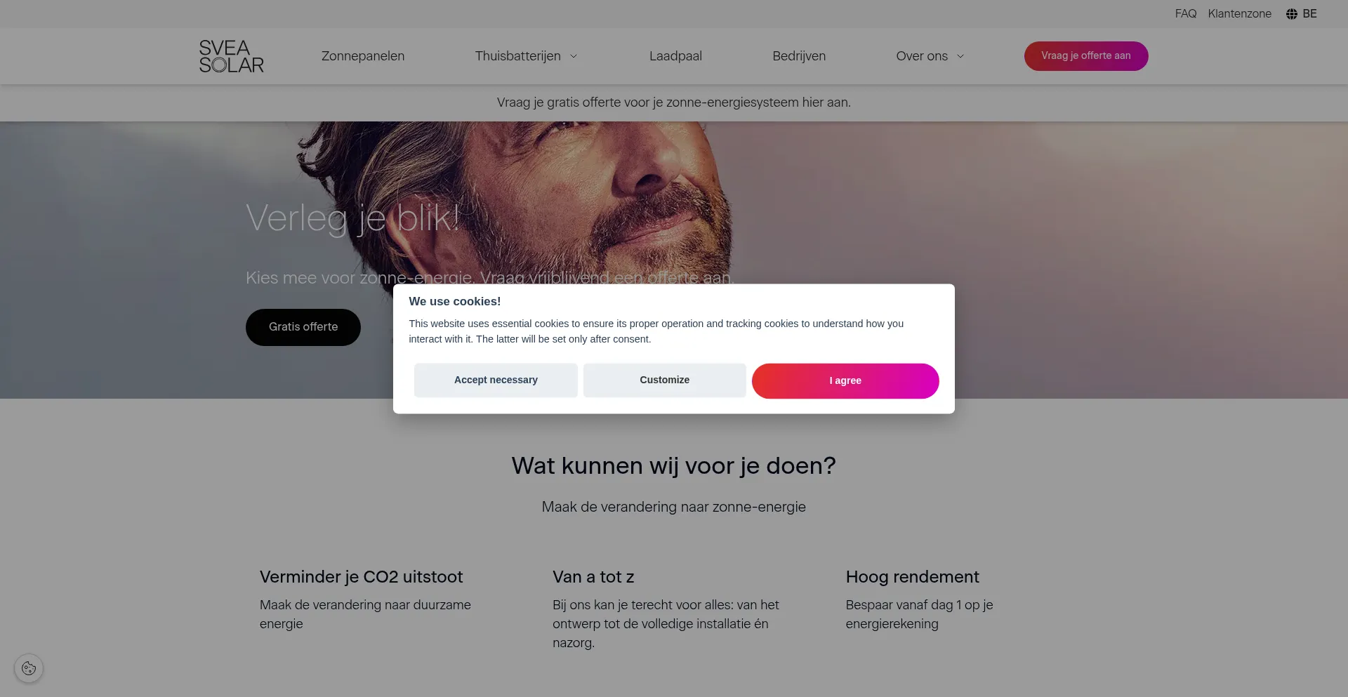 The website implements cookie consent mechanisms in compliance with privacy regulations such as GDPR or CCPA. This demonstrates that sveasolar.be adheres to data protection standards and provides users with control over personal data collection practices.