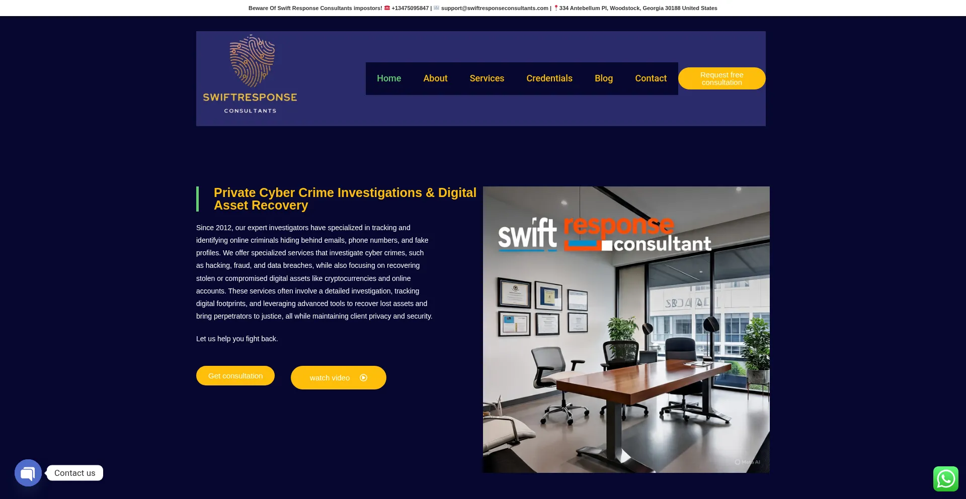 The website swiftresponseconsultants.com advertises fund recovery services for lost or stolen assets. While some operate on contingency fee structures, others may require upfront payments, which can indicate fraudulent operations. Verify credentials and regulatory compliance before engaging such services.