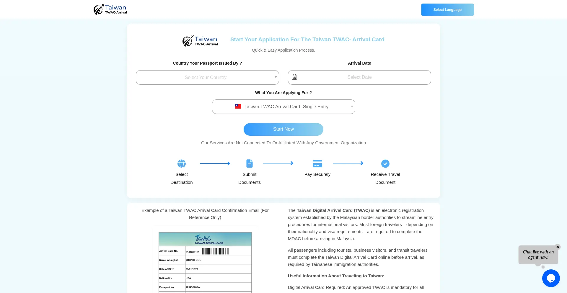 Apply for your Taiwan Arrival Card online. Fast, secure, and easy application process for visa-exempt travelers visiting Taiwan for tourism, business, or transit.