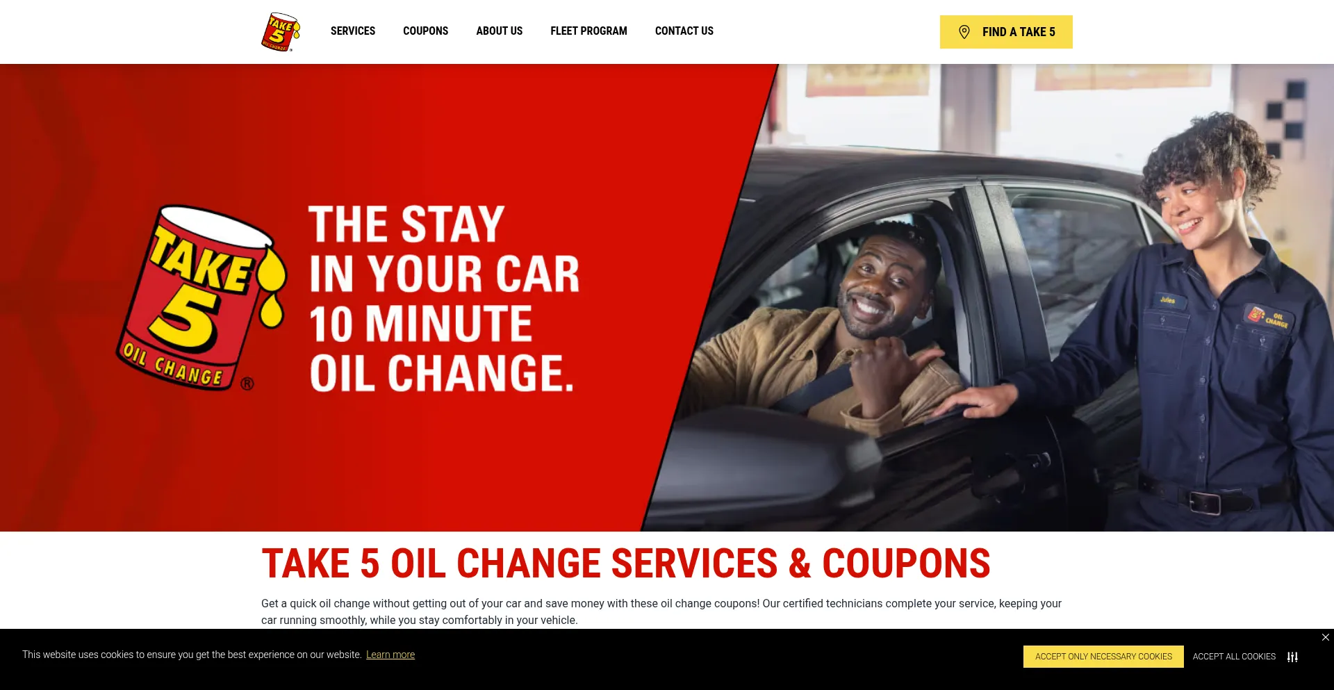 The website implements cookie consent mechanisms in compliance with privacy regulations such as GDPR or CCPA. This demonstrates that take5oilchange.com adheres to data protection standards and provides users with control over personal data collection practices.