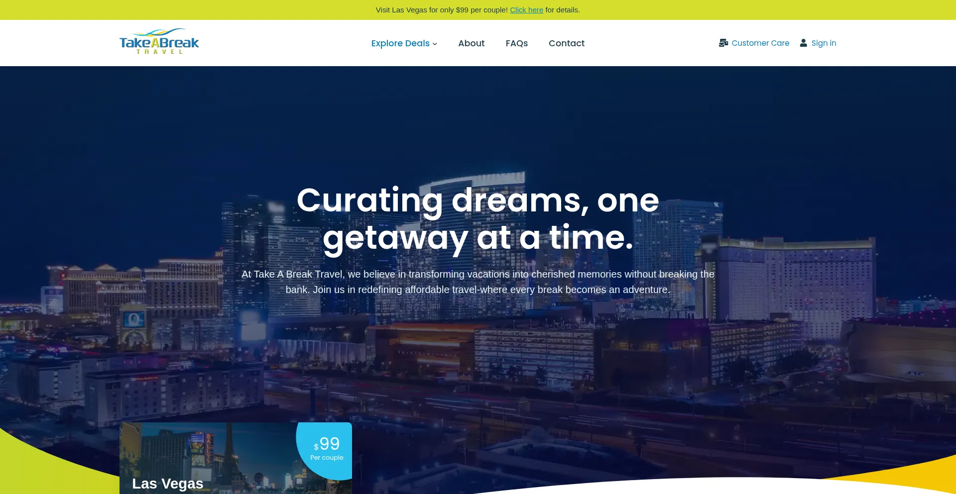 We scanned takeabreaktravel.com and found it to be legitimate. Our analysis shows a high trust score of 80/100, indicating this website appears to be very safe to use.
