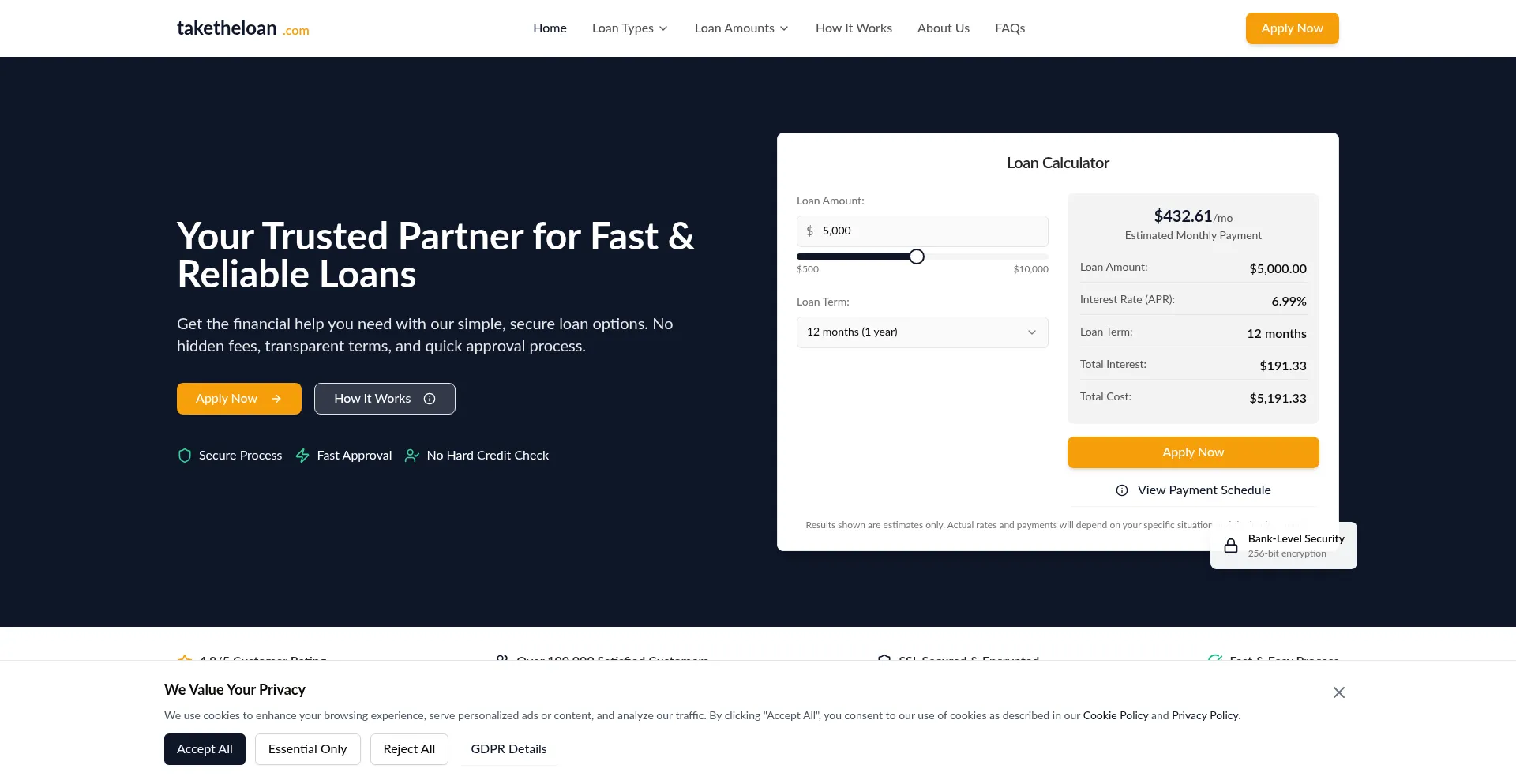 The taketheloan.com website implements data collection forms that may request personal information including names, email addresses, phone numbers, or other sensitive details. Users should verify the legitimacy of it and review privacy policies before submitting personal data.