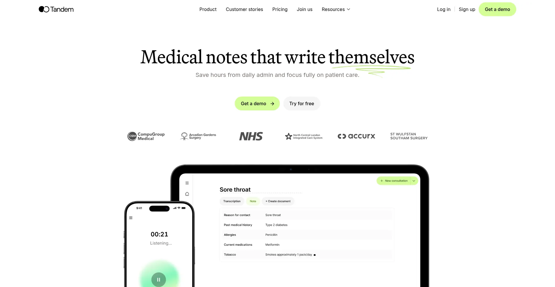 Focus on care while Tandem writes your notes after consultations. Boost healthcare productivity with our AI ambient scribe solution.