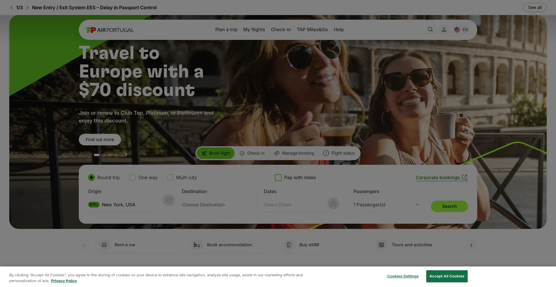 TAP Air Portugal welcomes you on board! Explore destinations and the cheapest flights, learn all about check-in, meals and TAP Miles&Go benefits. Book now!