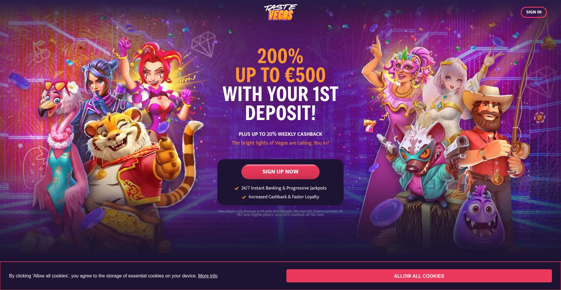 🍒 Welcome to Taste Vegas – Where the slots never sleep! Grab your golden ticket to €1,500 + 1,500 Free Spins 🔥 Hit the tables for Cashback, Jackpots, and loyalty that ...