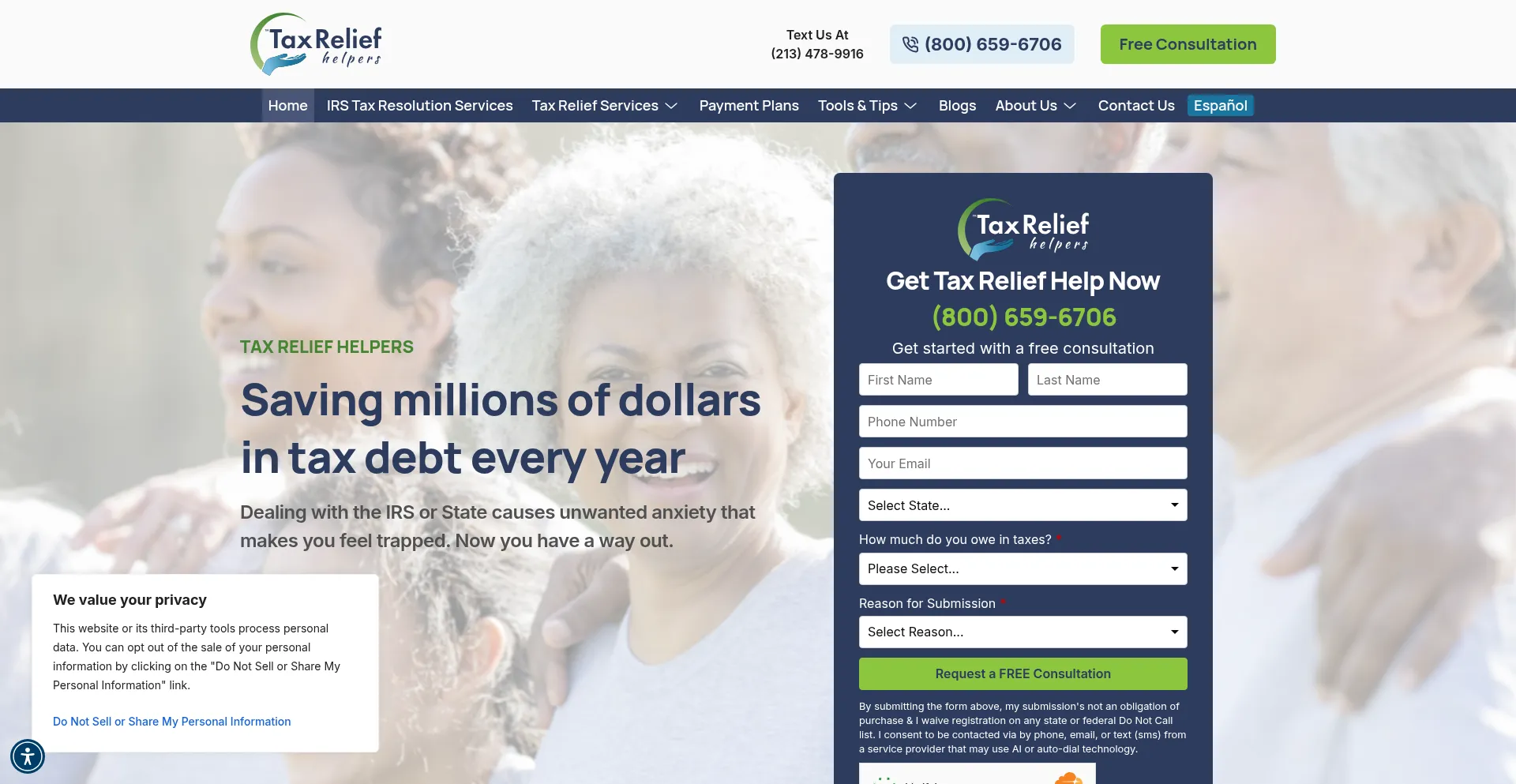 The taxreliefhelpers.com website implements data collection forms requesting personal information including names, email addresses, phone numbers, or other sensitive details. Users should verify the legitimacy of it and review privacy policies before submitting personal data.